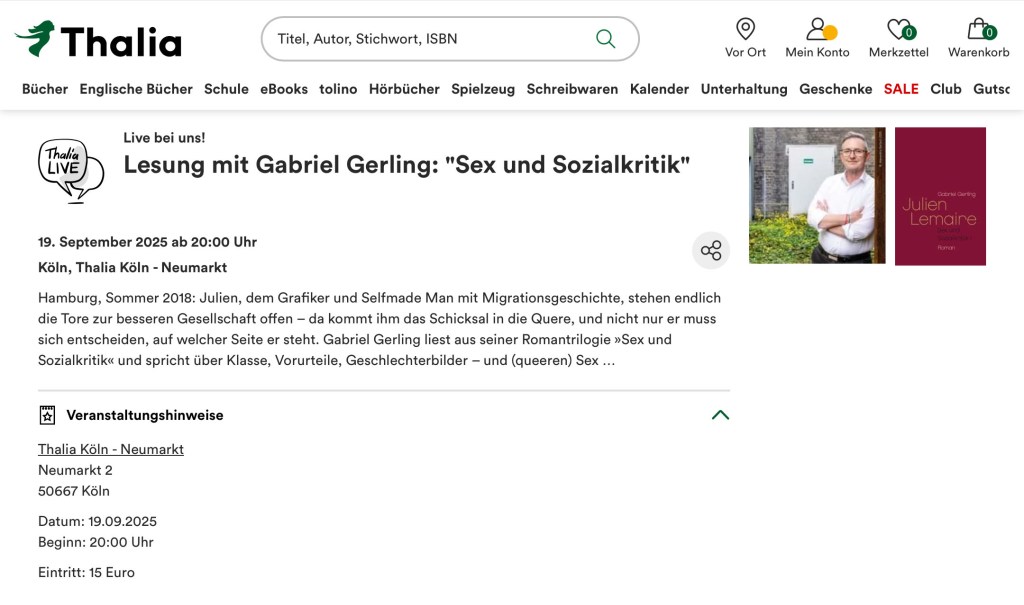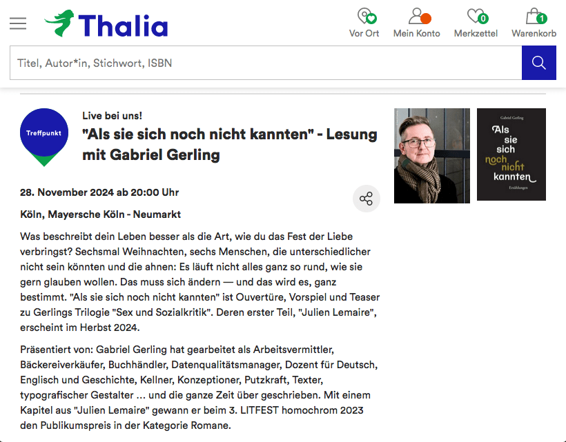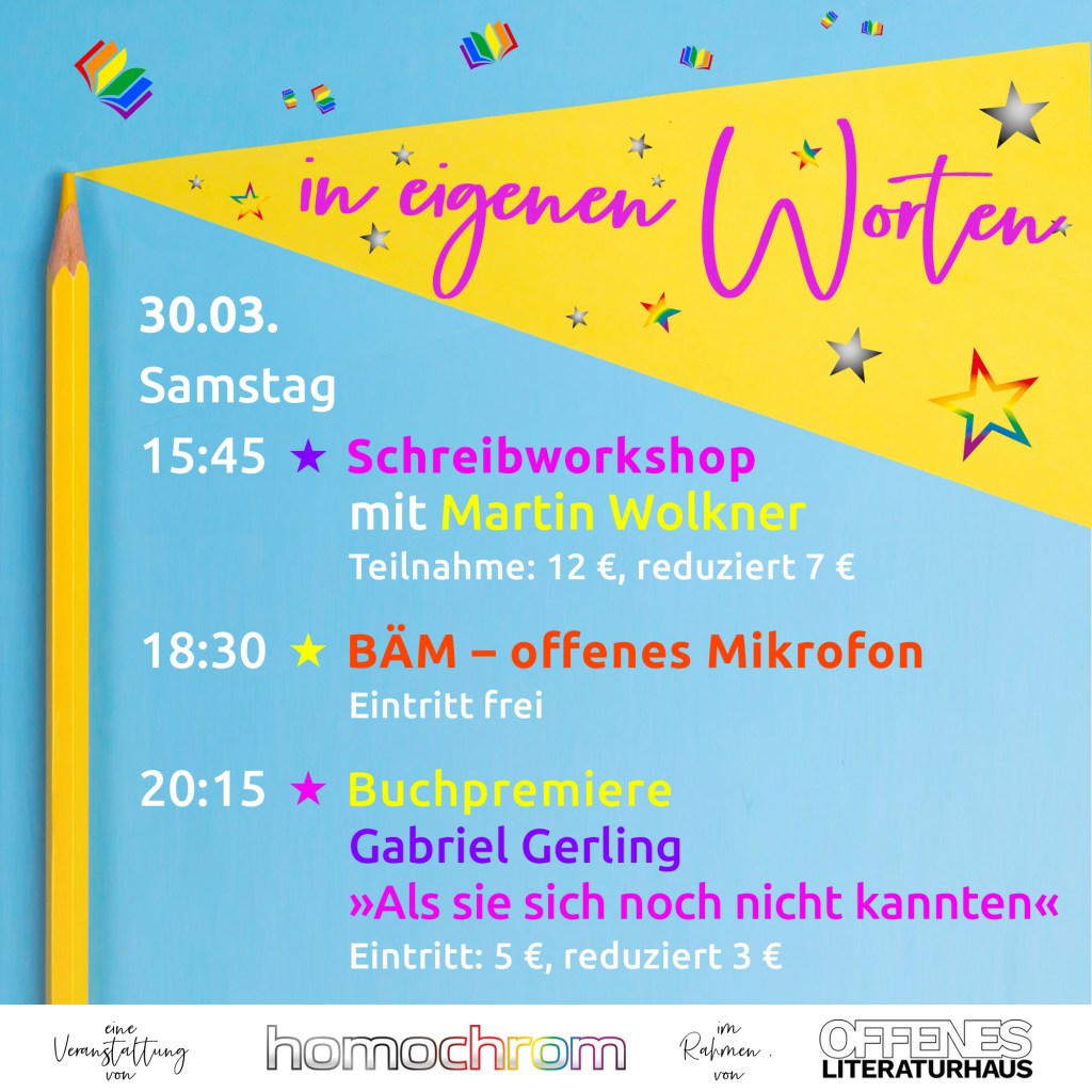 Zum Abschluss des Veranstaltungstages »in eigenen Worten« werde ich aus meinem neuen Buch »Als sie sich noch nicht kannten« lesen: meet Julien Lemaire, Protagonist meiner Romantrilogie »Sex und Sozialkritik«! Im Anschluss gibt es ein Gespräch zwischen Veranstalter Martin Wolkner, dem Publikum und mir. Mein Buch gibt es an dem Abend zu kaufen, und es wird natürlich jern von mir signiert.