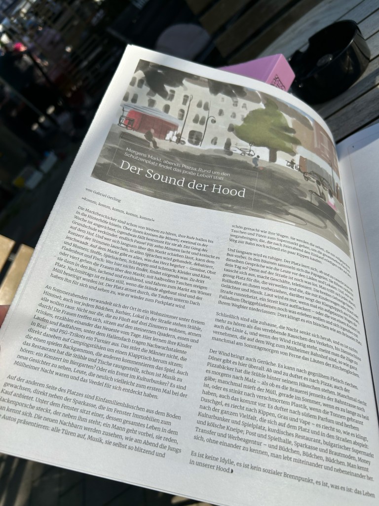 PS: Für die Mülheimia, die in dieser Ausgabe viele Artikel rund ums Thema Quartier Berliner Straße bietet, habe ich zudem ein Stück über den Sound der Hood geschrieben: Wie klingt das Leben rund um dem Marktplatz, wie riecht es, wie fühlt es sich an? Lest selbst!