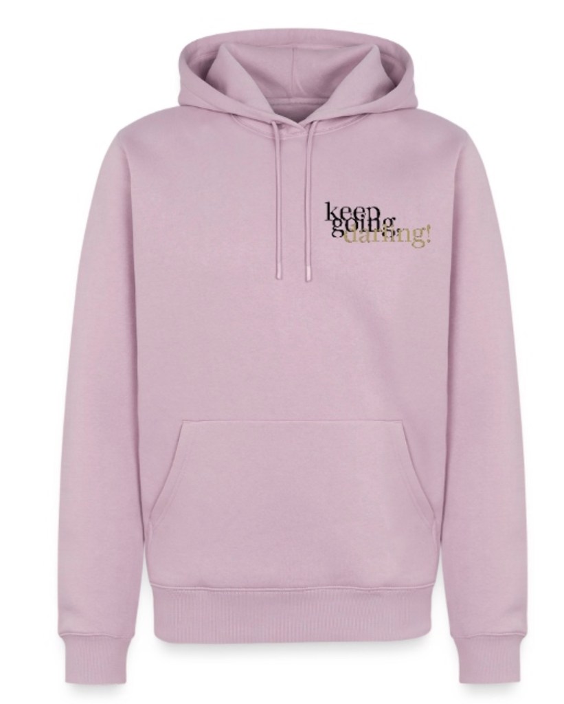 Eine bessere Welt ist möglich! Wirklich? Ja, wenn du dranbleibst! Sind die Zeiten auch kalt und grau, dieser dicke weiche Hoodie in Zukunftsrosé hält dich beim Weltretten warm. Keep going, darling!
