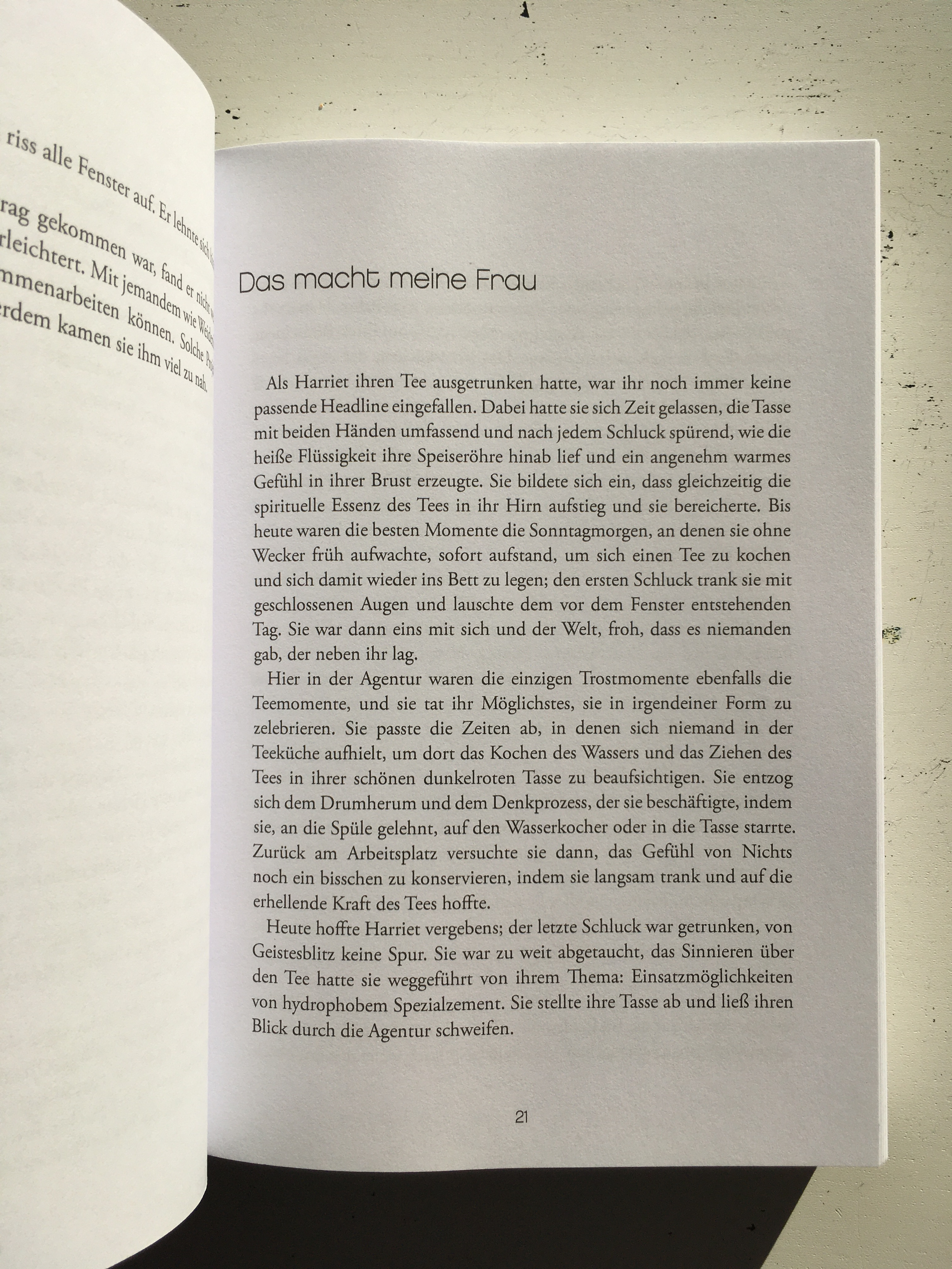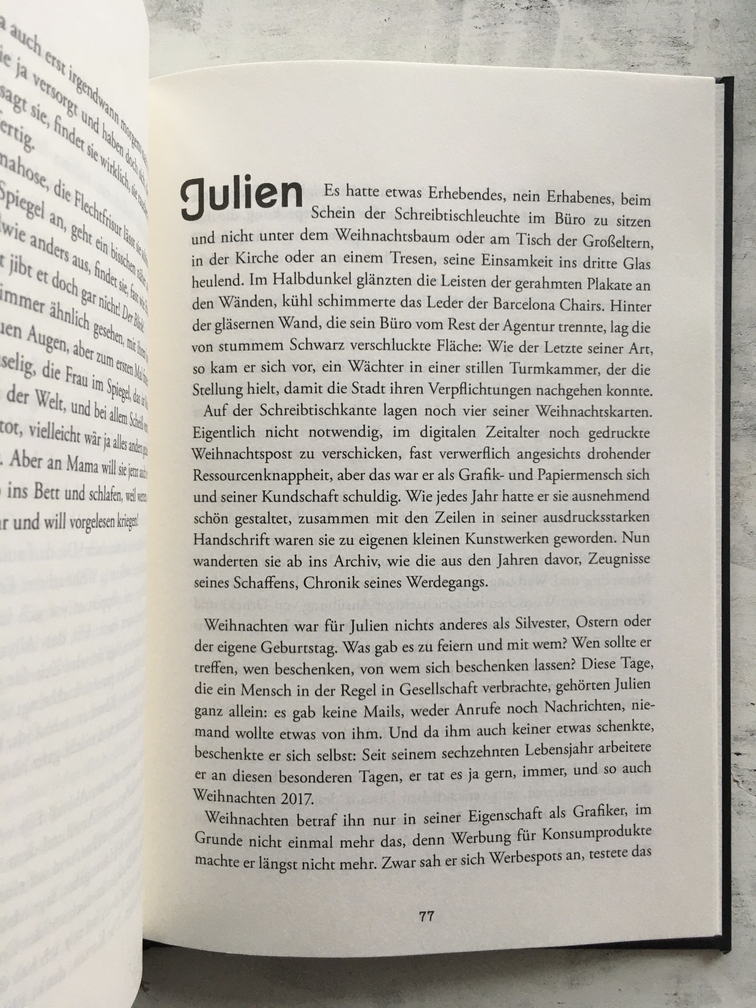 »Weihnachten war für Julien nichts anderes als Silvester, Ostern oder der eigene Geburtstag. Was gab es zu feiern und mit wem? Wen sollte er treffen, wen beschenken, von wem sich beschenken lassen? Diese Tage, die ein Mensch in der Regel in Gesellschaft verbrachte, gehörten Julien ganz allein: Es gab keine Mails, weder Anrufe noch Nachrichten, niemand wollte etwas von ihm. Und da ihm auch keiner etwas schenkte, beschenkte er sich selbst: Seit seinem sechzehnten Lebensjahr arbeitete er an diesen besonderen Tagen, er tat es ja gern, immer, und so auch Weihnachten 2017.«