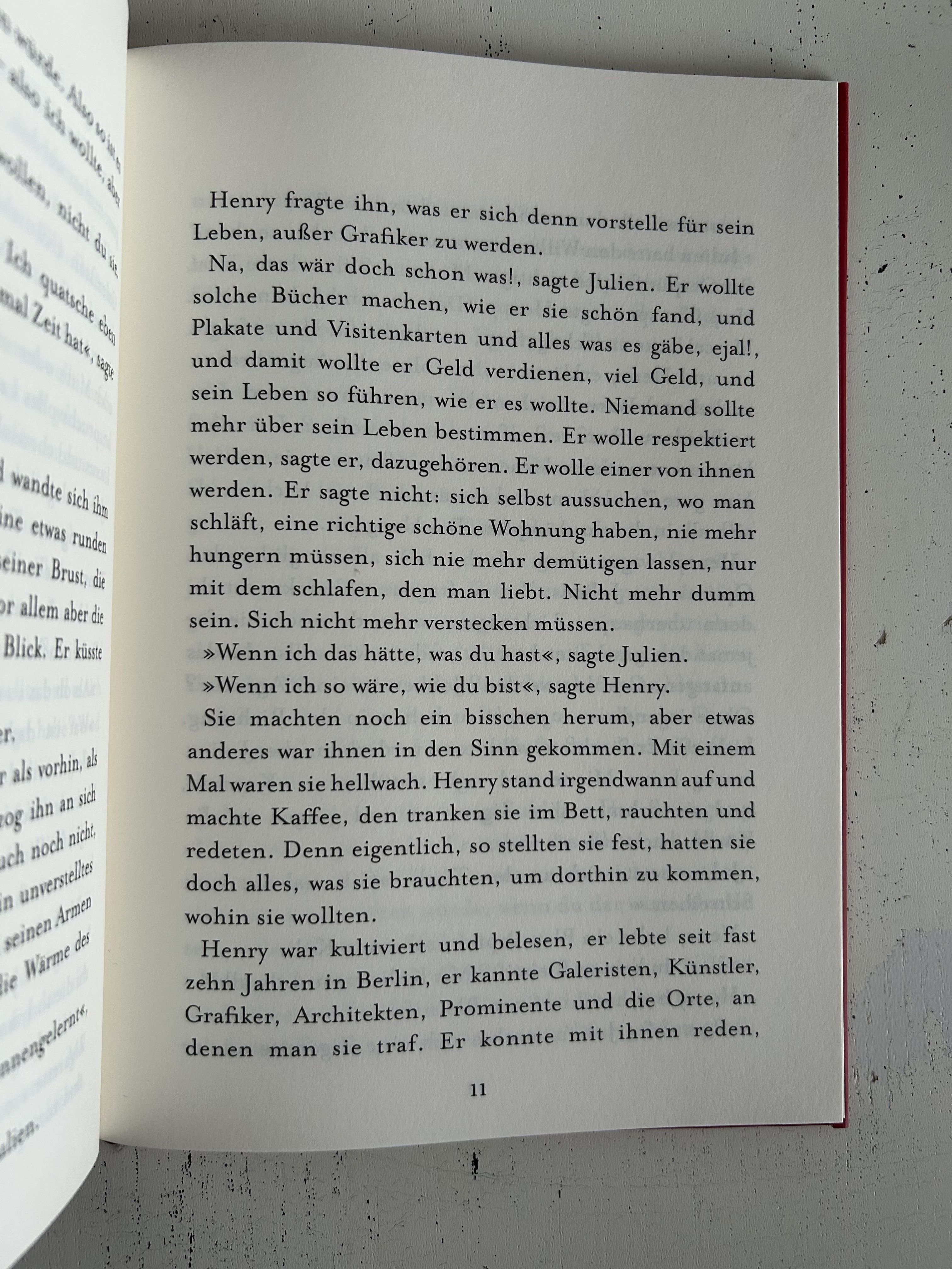 Es dauerte nicht lange, bis Henry herausfand, was es mit Julien auf sich hatte: Dass er aus dem Nichts kam und hinaufstrebte in die Wirklichkeit, in Anerkennung und Wohlstand. Aber das störte Henry nicht. Er konnte sich eben wirklich alles vorstellen, nicht nur, weil er Buchhändler war, sondern Henry.«